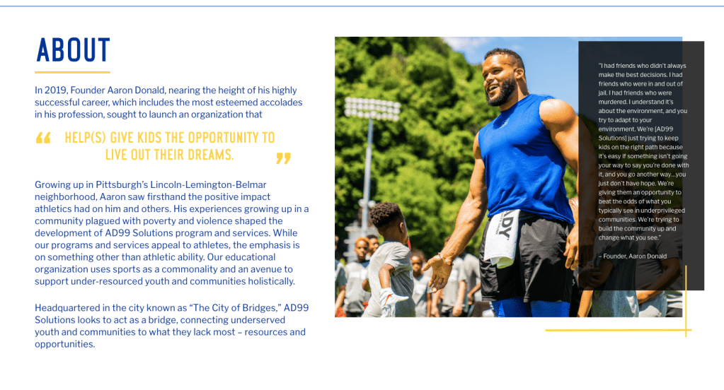 Pittsburgh is known as the “City of Bridges.” Playing to the city’s nickname, AD99 Solutions aims to be the bridge, connecting underserved youth and communities to the resources and opportunities they lack. They display their mission above by doing one of the many things they do annually, hosting the “Living in the Pocket Skills Camp.”
