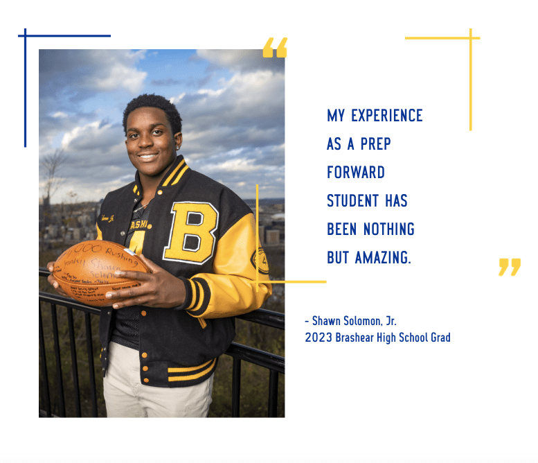 Prep Forward is a year round program responsible for training black athletes ages 13-18. It provides them resources to reach Post-secondary success through educationally valuable opportunities. Shawn Solomon Jr., current running back for the Duquesne Dukes, graduated from the Prep Forward Program.